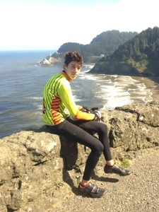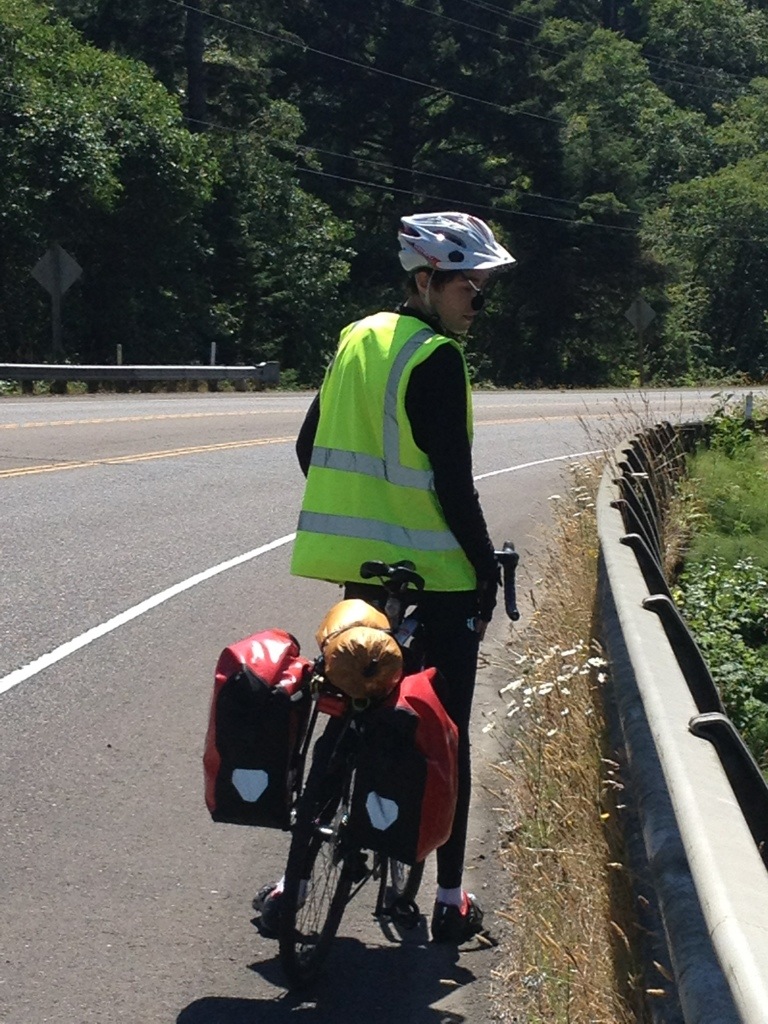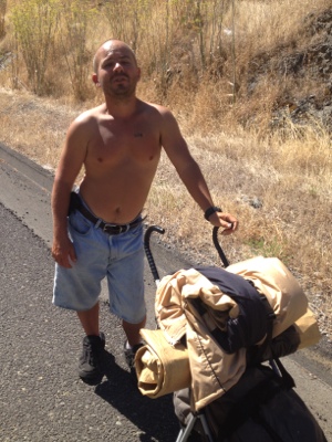 After riding a while I came across Daniel. He looks weird here but he wasn’t as weird as you would think for someone who was pushing his backpacks in a baby carriage up Hwy One. He had left San Francisco ten days ago and was headed towards Oregon. He had the word “LOVE” in small letters tattooed over his heart. I gave him a protein bar and we went our ways.