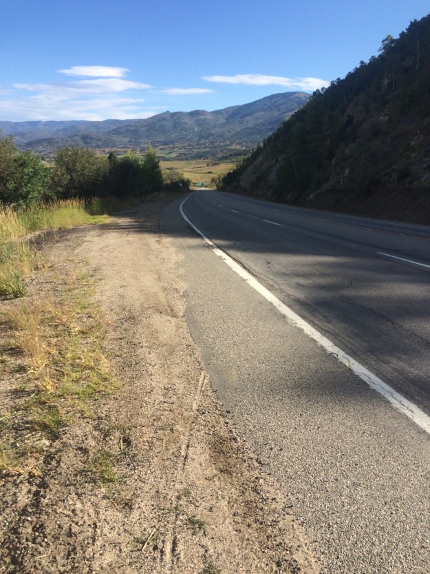 On the road I met a fellow biker going the other way. He was one of those mega-muscle men with an expensive bike in a biking outfit. He had a handlebar bag and another tiny little bag hanging from the main bar. He was traveling from Telluride to someplace I’ve never heard of. He had no panniers. He was only staying in hotels and his bike clothes we’re the only clothes he had. I envied that.