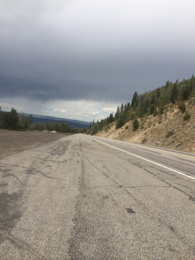 I got rained on a bit but not much. I found out later that storms were so bad near Vernal that there was 3″ of hail on the road! Hail is hard to imagine because its way hot here and I havent had any, I mean NONE, shade thus entire trip.