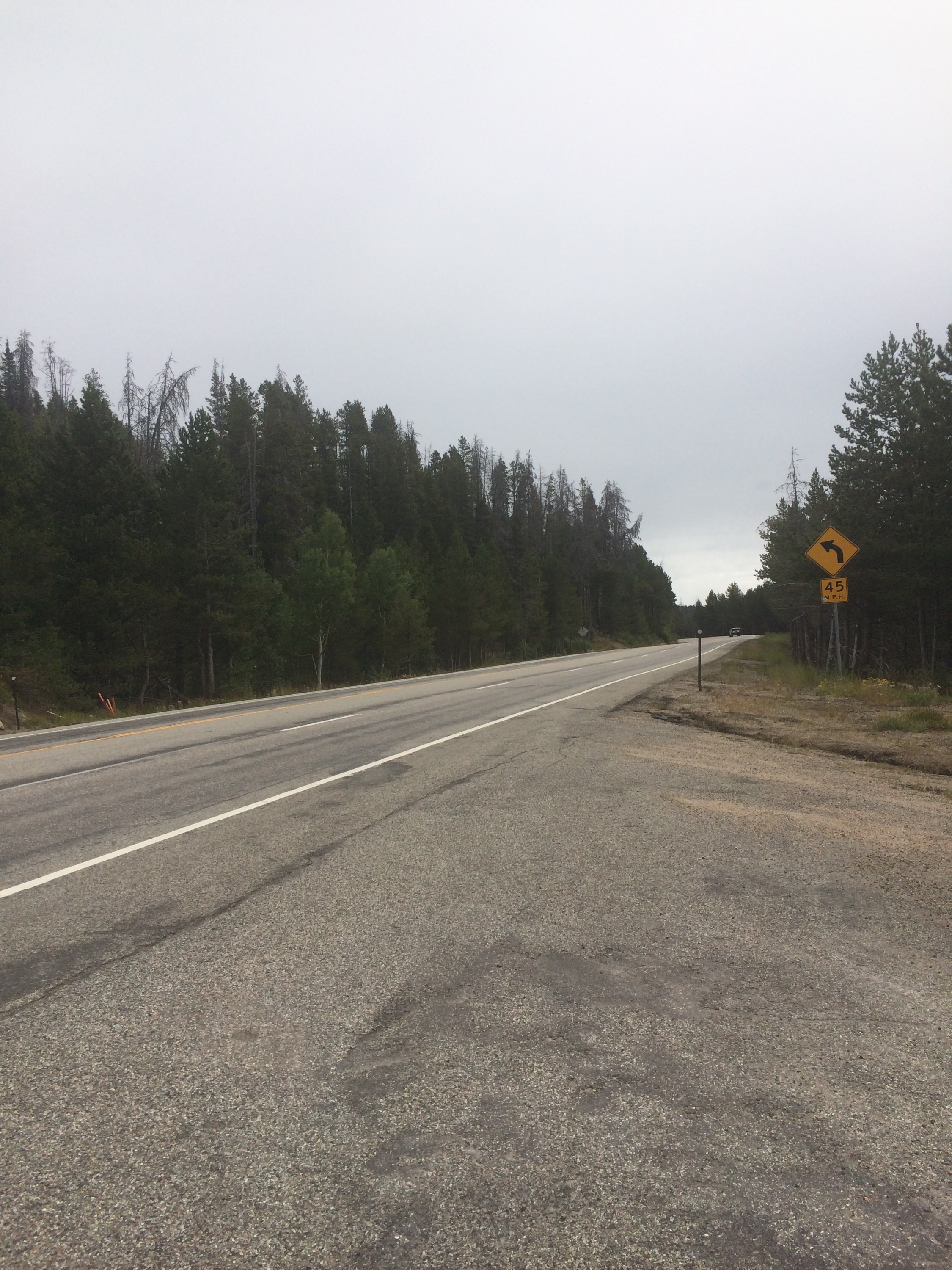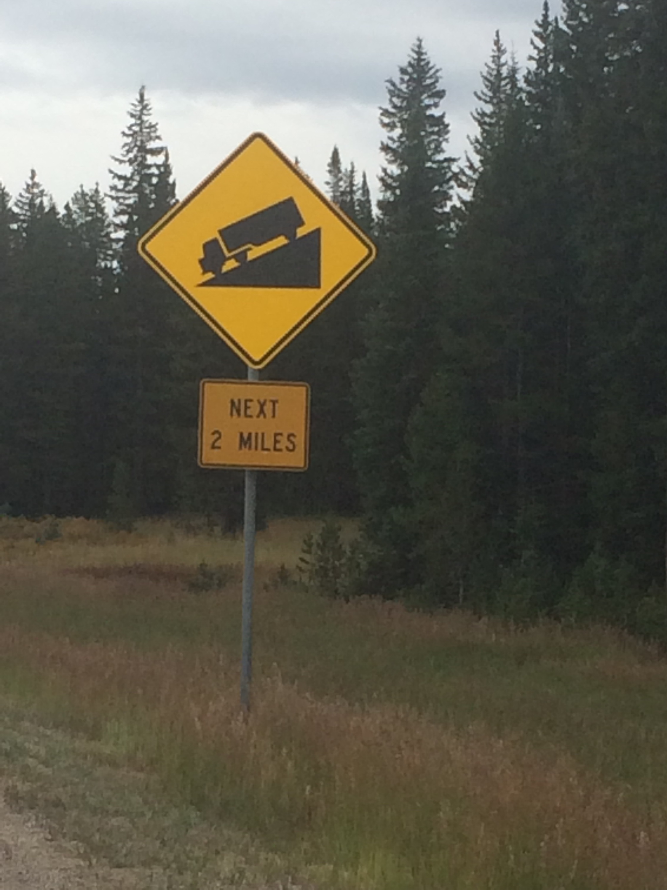 I am above the tree line. It’s other-worldly. The steepest part is called “Medicine Curve”.  There’s NO shoulder and the wind is incredible. There’s no way I can describe the wind. I have never ever ever ever have been in such strong wind. It’s coming from every direction and nothing to break out for miles. The long grass is entirely flattened by the wind