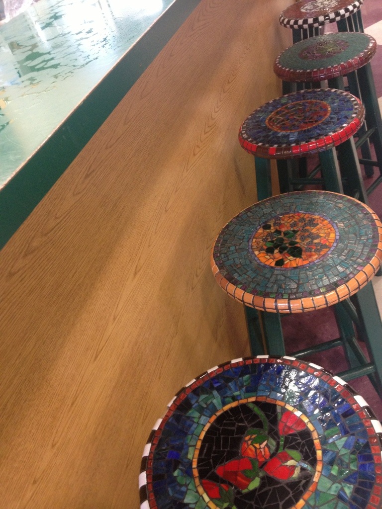 The poster board outside the health food store looked historic but it was all advertising current events. The stools at the smoothies counter were done in top notch mosaics.